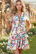 Floral Print Zipper Ruffled Short Sleeve High Waist Mini Dress